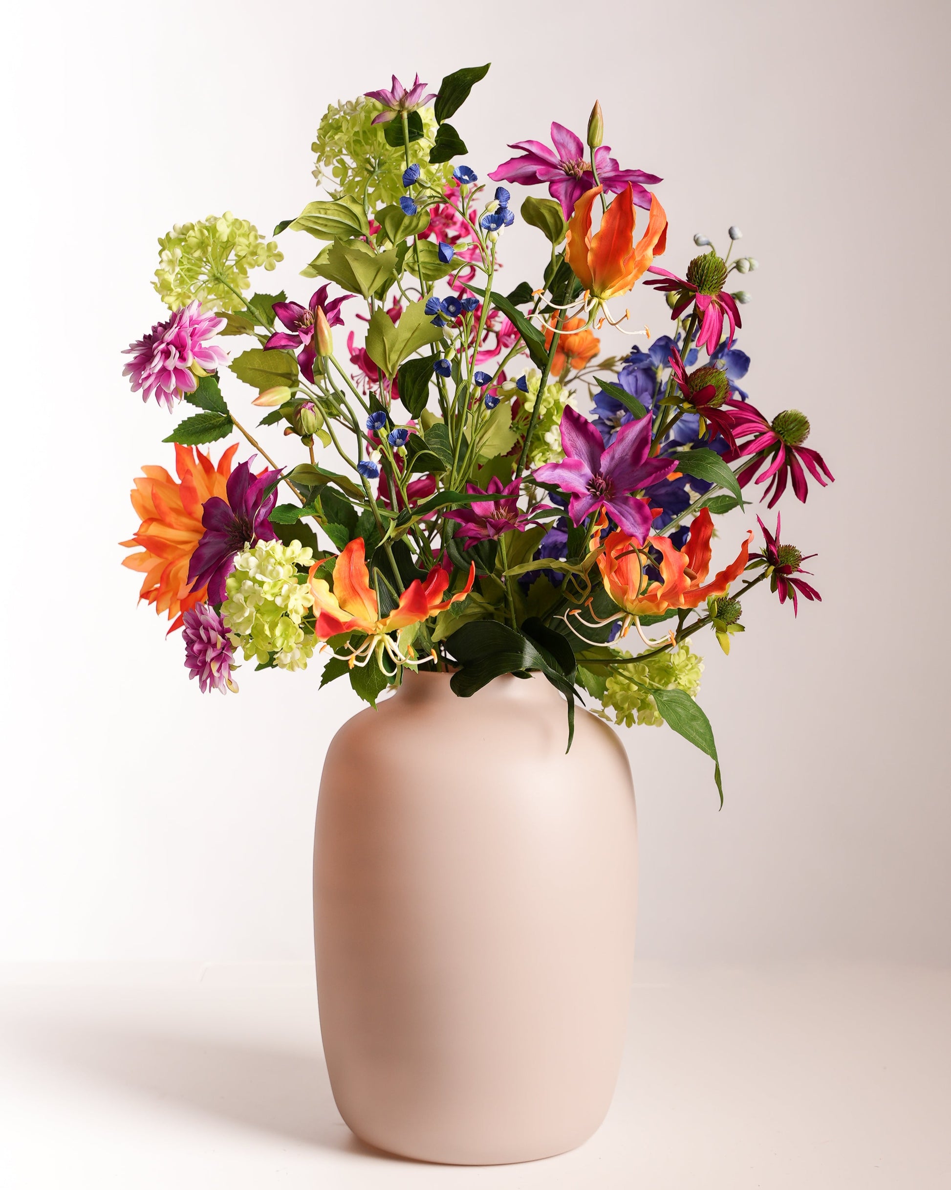 Breng een explosie van kleur en elegantie in huis met Boeket Jessica, een kunstboeket van levensechte, zijden bloemen. Dit sprankelende arrangement combineert zonnig oranje gloriosa‑lelies, levendige fuchsia clematis en frisse limegroene snowbals, afgewisseld met kleine blauwpaarse veldbloemen. Dit royale boeket is het perfecte statement in elke ruimte, van woonkamer en eetkamer tot kantoor en ontvangsthal.