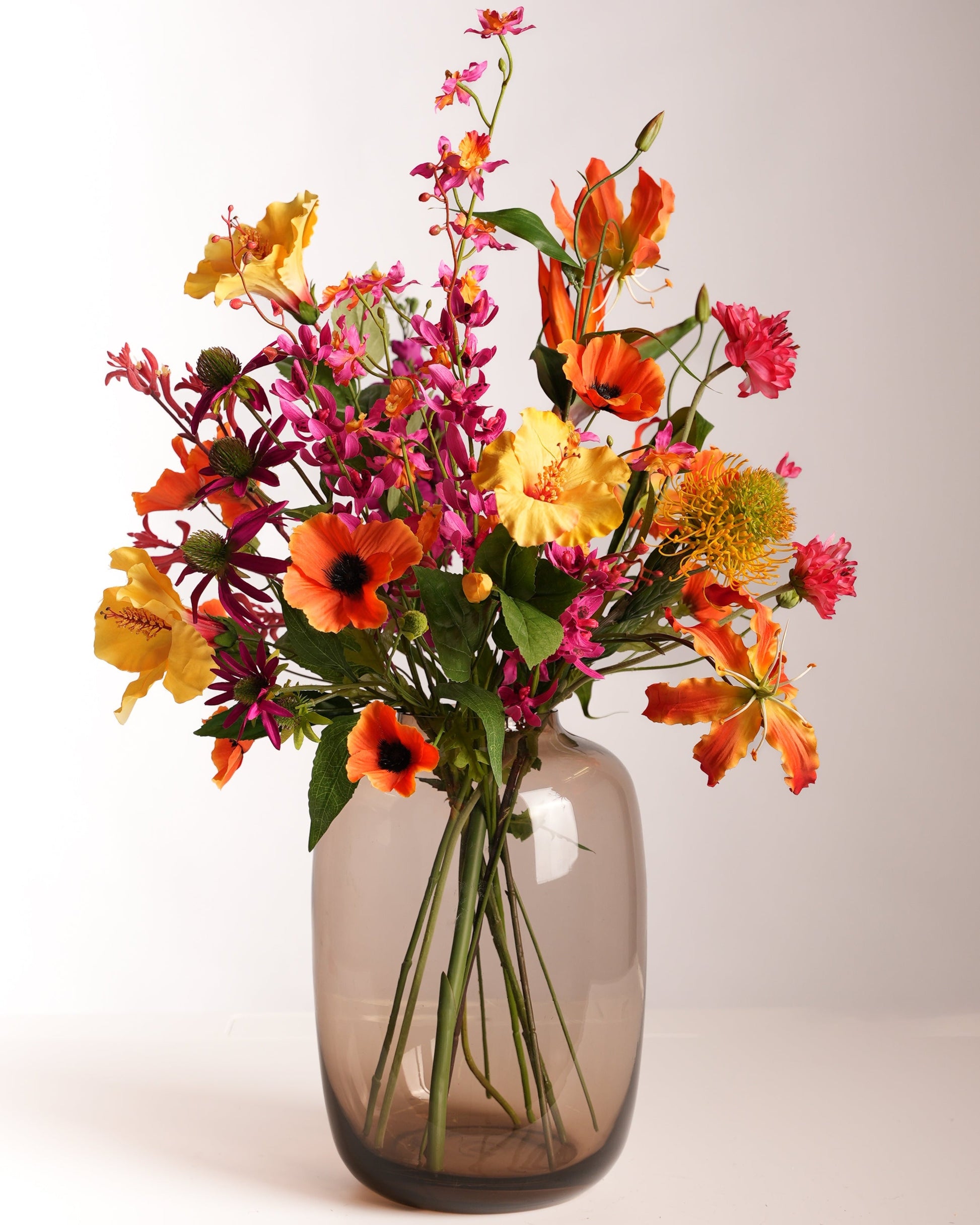 Boeket Nina is een stijlvolle en kleurrijke toevoeging aan ieder interieur. Dit boeket, met zijn levendige oranje, fuchsia en gele tinten, straalt positiviteit en energie uit, met een tropisch tintje. Dankzij de hoogwaardige zijden bloemen geniet je jarenlang van een prachtig boeket dat niet van echt te onderscheiden is. Het boeket Nina is ideaal voor iedereen die houdt van gemak, duurzaamheid en een blijvende bloemenpracht in huis.