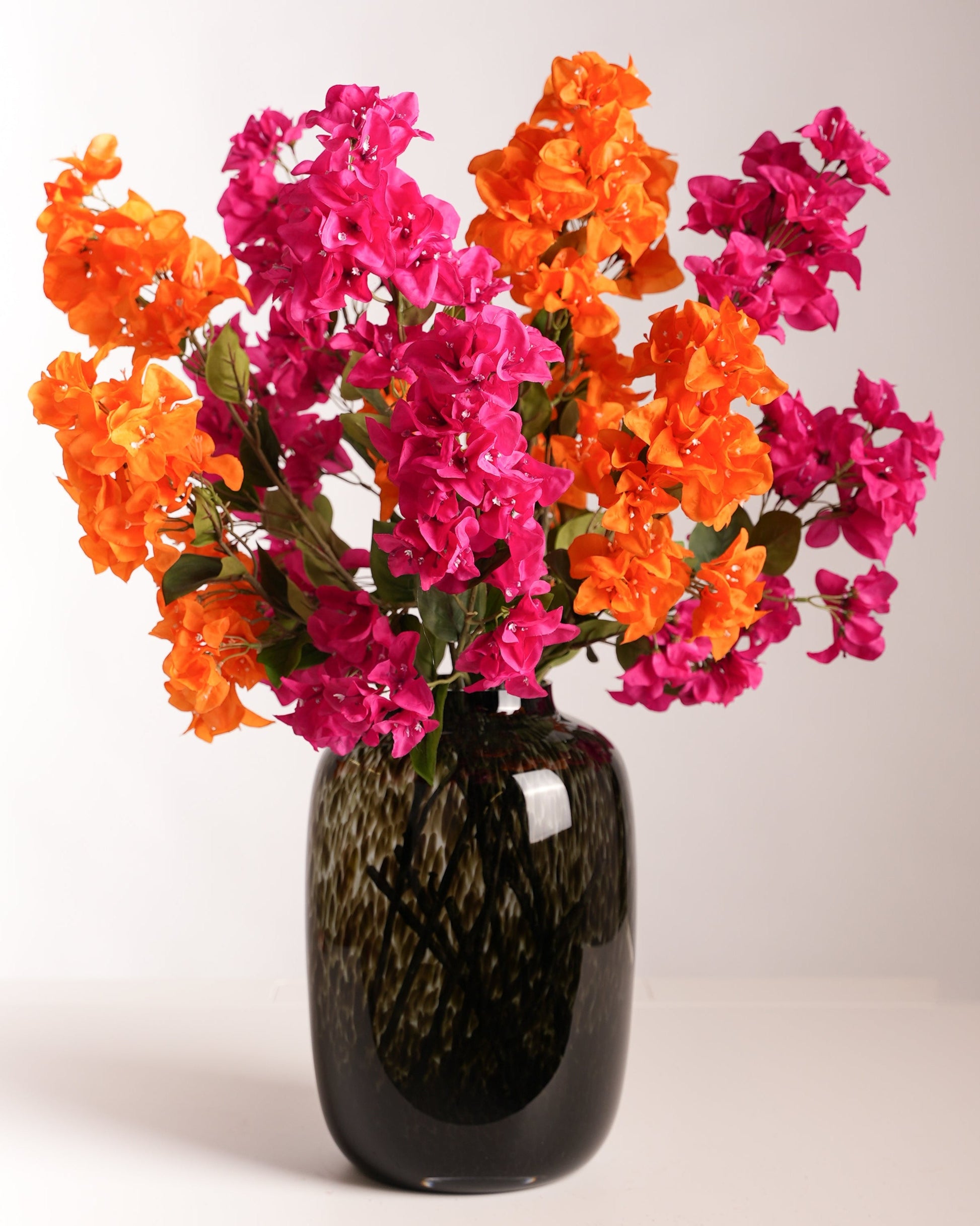 Boeket Vera is een ware eyecatcher voor ieder interieur. Dit boeket combineert opvallende oranje en fuchsia tinten in een stijlvolle, Jazz vaas (cheetah) en brengt direct kleur, vrolijkheid en luxe in huis. Dankzij het gebruik van hoogwaardige zijden bloemen geniet je jarenlang van een prachtig, onderhoudsvrij boeket dat niet van echt te onderscheiden is.